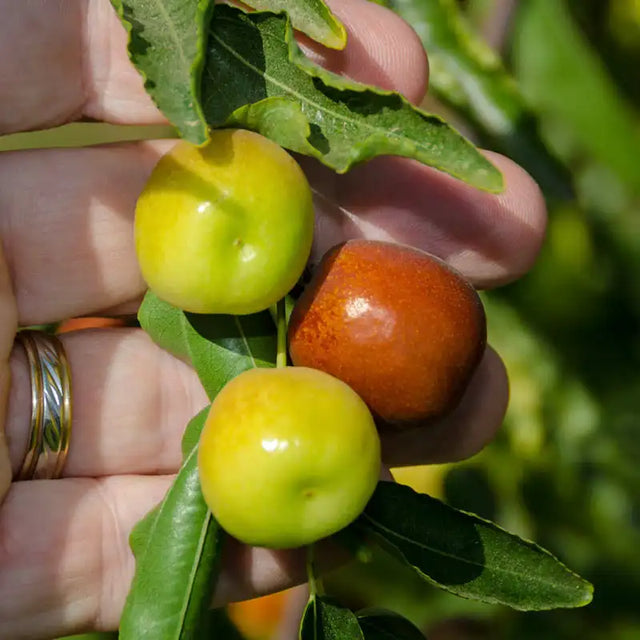 Add sweet, crispy fruit to your garden with our jujube fruit trees for sale, and see why gardeners love this unique fruit. Jujube trees are deciduous from China and grow particularly well in hot and arid regions. Also known as Chinese dates or red dates, they are prized for their tasty and nutritious fruit. Jujubes are hardy, drought-tolerant, and can thrive in various soil types. They also sport a unique look, with a tall growth habit, shiny fruit, and glossy green leaves. The fruits, resembling small dates, mature to a wrinkled, sweet, and chewy texture when fully ripe. Jujubes are rich in vitamins, minerals, and antioxidants. These trees are a delightful addition to home orchards or ornamental landscapes.