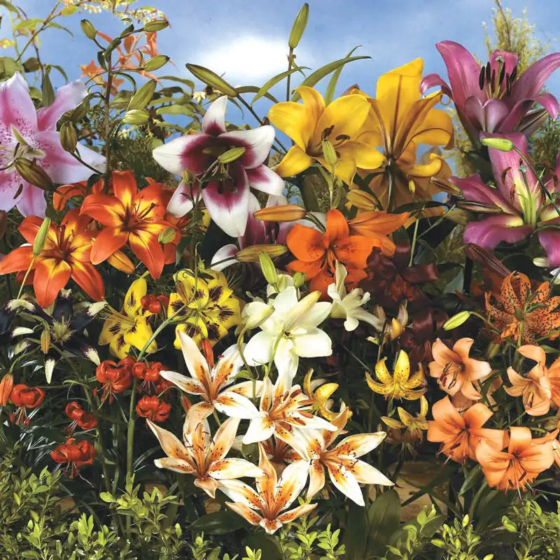 - Includes mix of Asiatic, oriental, tiger and trumpet lilies