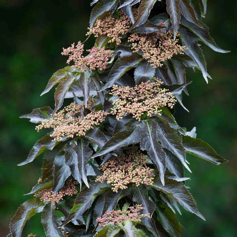 Add dramatic flair to your garden with Black Tower Elderberry (Sambucus nigra 'Eiffel 1'), a striking shrub with deep, nearly black foliage and a narrow, upright form. In early summer, it blooms with soft pink flower clusters that contrast beautifully against the dark leaves and attract bees and butterflies.