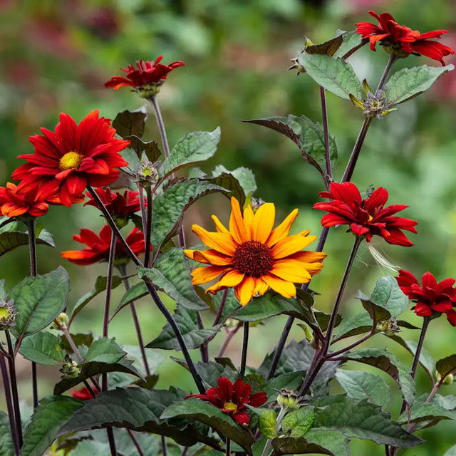 Easy-care perennial adds plenty of pizzazz to wildflower, perennial and pollinator gardens with the colors of a sunset. Bleeding Hearts False Sunflower features flowers that begin fire red and fade to orange-red and bronze hues. Dark purple foliage and black stems provide a dramatic backdrop for the flowers. A native North American perennial, Bleeding Hearts blooms from early summer until fall and lures pollinators to the garden. Growing 3-4 ft. tall, this plant naturalizes well and also makes a long-lasting cut flower. Performs best in full sun.
