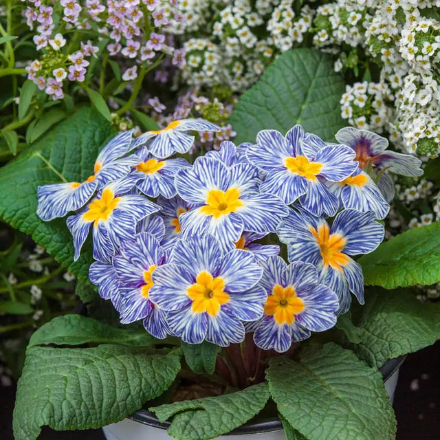 Spot this primrose and you won't be able to resist a second look — its blue striped pattern is extraordinarily contrasted against a bright yellow heart. Upright habit is perfect for starring in the front row of borders, mixes or in a container all on its own.