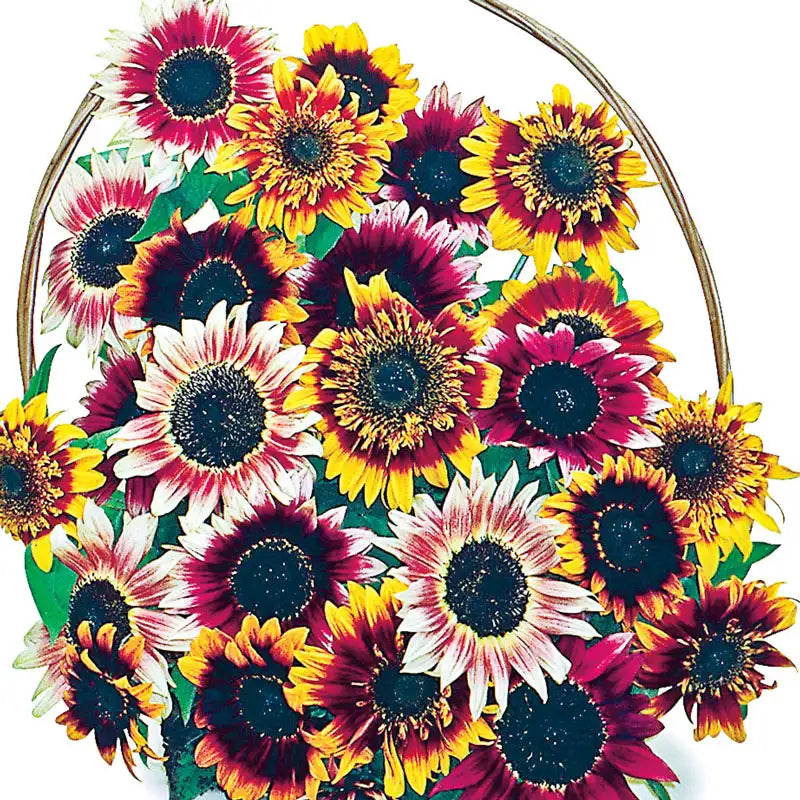 One of our favorite sunflower varieties for cut-flower displays! The pollenless flowers create a dramatic, neat look in vases and bouquets. This stunning blend of beautiful bicolor blooms also stands out in borders and cutting gardens. Growing 4-5 ft. tall, Bohemian Rhapsody Sunflower produces a large, 5-6 in. flower on its main stem, and often sends out branching stems that set smaller flowers. The flowers attract bees and pollinators. An annual flower, it grows best in full sun. 55-65 DAYS.