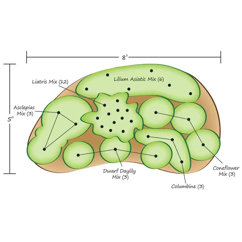 Butterfly gardens don't get much easier than this! This kit contains 30 perennials that will provide colorful flowers and attract butterflies for months. Designed to fill a 5 ft. x 8 ft. area, it includes 6 Asiatic Lilies Mixed, 12 Liatris spicata (white and purple), 3 Columbine Mix, 3 Dwarf Daylilies (red, pink and yellow), 3 Coneflowers (purple, white and yellow) and 3 Asclepias (orange and white). All of the perennials are easy to grow and easy to maintain. Because the perennials have different bloom times, you'll have flowers from late spring to late summer. Performs best with planted in full sun to partial shade. Zones 5-9.