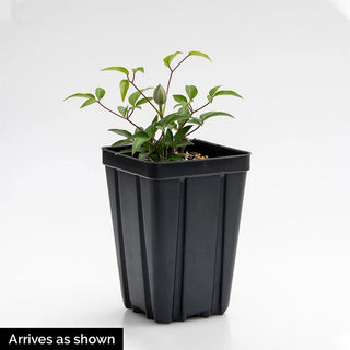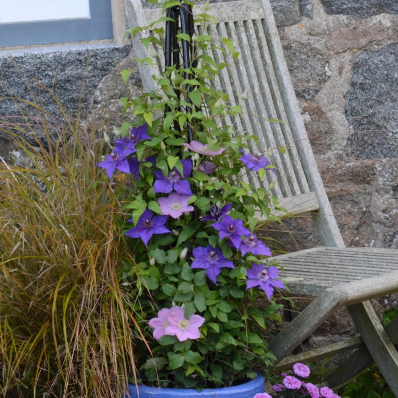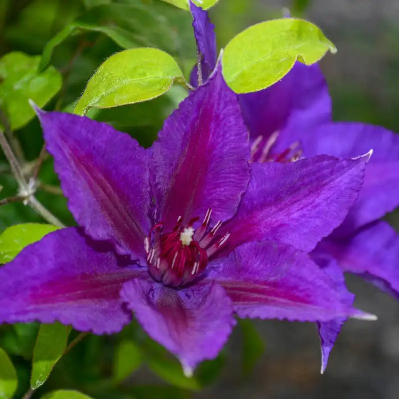 These flowers are gorgeous. The compelling and contrasting jewel-toned purple-and-red sepals are worthy of a closer look, so we suggest using Edda as a patio accent in a container. In fact, Edda was bred for a bushy habit that will fill out perfectly in a container planting. But if you want it out in the garden, it also pairs well with a larger garden Clematis on a trellis or arch for a colorful show. Clematis 'Evipo074' PP28407