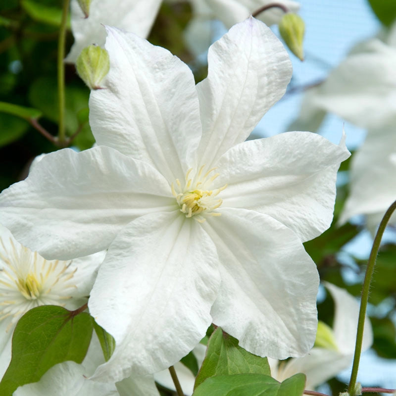 Step into your garden and be enveloped in a profusion of pure white flowers. With Clematis Snow Storm, this dream becomes a reality. One of the newest Polish cultivars, it flowers profusely, producing waves of large, pure white blooms centered with lovely blonde hues. Each sepal's nuanced waviness adds a touch of sophistication, making Snow Storm a standout in any garden.