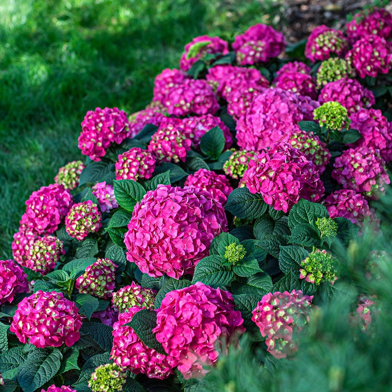 There are plenty of red hydrangeas in Europe, but USA doesn't really have the climate for this color in hydrangeas. It didn't come close, until Summer Crush, whose rich raspberry red hues are the nearest to true red that any hydrangea has ever been in US soil. It's on a gorgeous, impressively heat–tolerant plant, too. Rich green, serrated foliage fills out a compact habit, up to 3' tall. It is extremely bud hardy, so it will reliably bloom on both old and new wood. The wealth of flowers will bring on the butterflies. Also, as a macrophylla, it changes colors depending on the pH balance of the soil, but not to the typical blue. If your soil is more acidic, with a good aluminum availability, it will flower in rich purple.