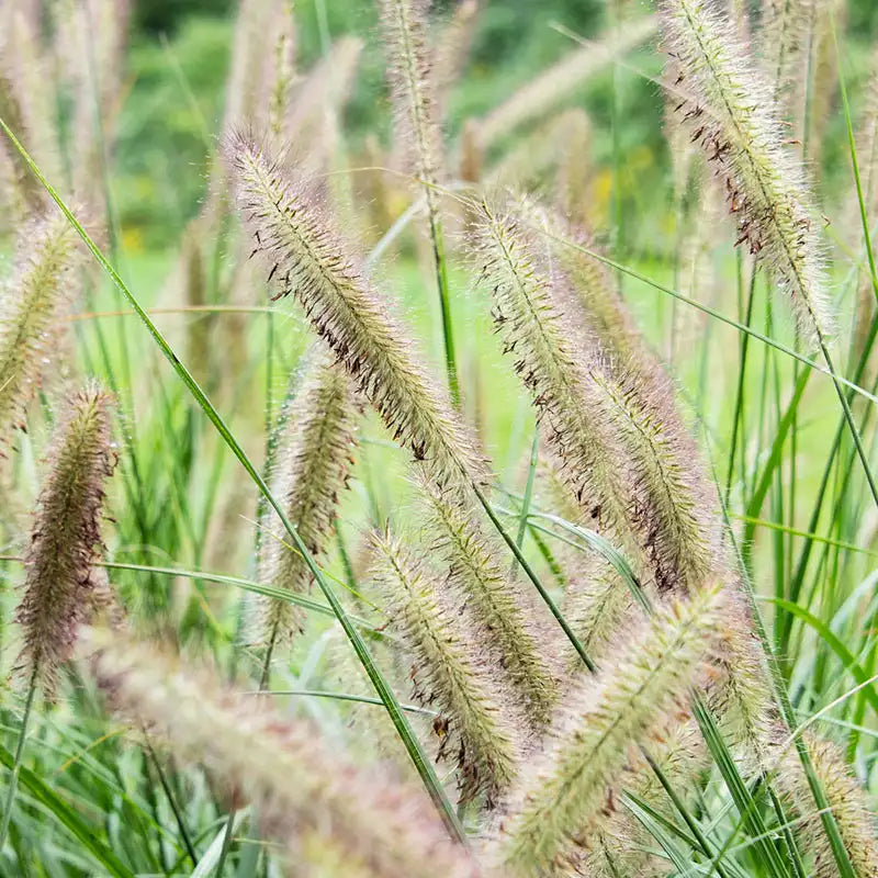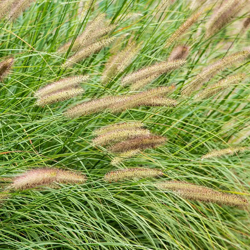 As eye-catching as its namesake dance, Fox Trot Fountain Grass adds months of texture, movement and color to the garden. Smoky purple, pink and red-toned, bottlebrush plumes put on a quite a display when they bloom and dance in the summer breeze. The 5-7 in. long flower spikes also make wonderful fillers in cut-flower displays. The perennial grass's bright green foliage turns golden brown in the fall. Growing 4-5 ft. tall with a similar spread, Fox Trot has a fountain-like habit and can be planted as a focal point or grouped together along a border. Deer tend to pass it by.