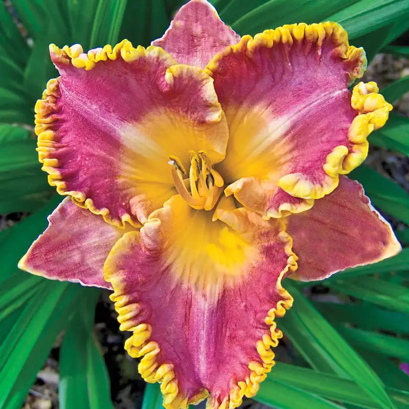 So many ruffles! Pretty lavender flowers with heavily ruffled, golden edges are such to brighten the border. Large blooms can reach up to 6 inches across and are produced on 24-26 inch stems. Handsome foliage is a beautiful backdrop for these beautiful blooms and add texture to the garden. Reblooms in late summer. Great deer and drought resistance. Zones 3-9.
