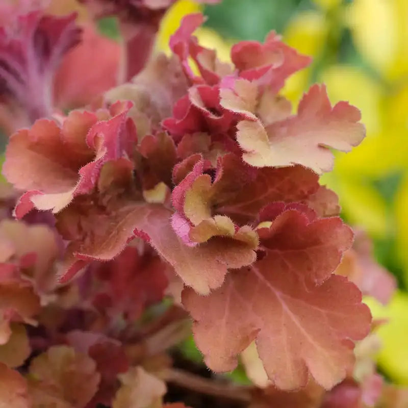One of the showiest heucheras we've found! The heavily ruffled leaves feature a range of hues, from caramel, gold and red tones, depending on the light exposure. In the summer, pale pink, bell-shaped flowers open above the foliage, attracting hummingbirds. Growing 12-15 inches tall with a neat, rounded, compact habit, Frilly Coral Bells makes a pretty perennial ground cover or accent plant near the front border. It's also suitable for growing in containers. Deer tend to pass it by. Grows best in partial shade to full shade. Zones 5-9.