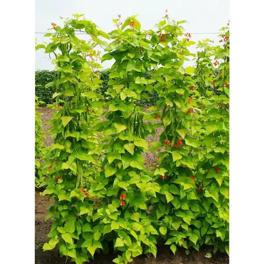 This is the showiest runner bean we've found! The chartreuse foliage appears to glow in the sunlight and provides a contrast to the loads of scarlet red flowers that beckon hummingbirds. The climbing plants produce a bumper crop of tender, flattened, 5-6 in. green pods that are excellent for eating fresh, canning and freezing. Golden Sunshine Runner Bean grows 5-8 ft. tall and requires some type of support, such as a fence or trellis. It's sure to add color and interest to the flowerbed, garden or edible landscape. 85 DAYS.