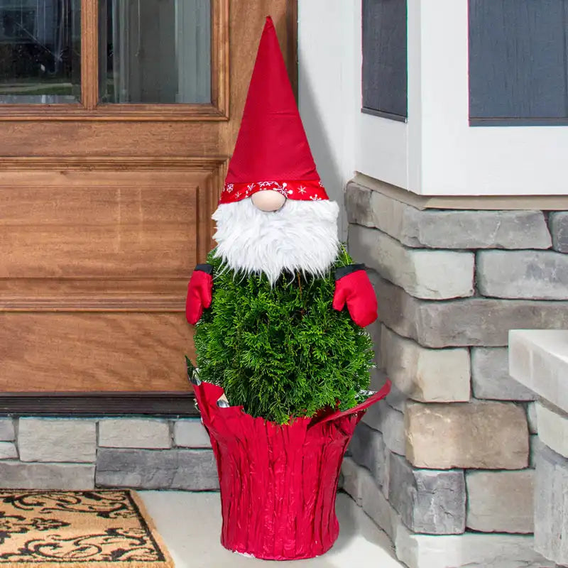 This charming gnome can be part of your outdoor décor, greeting holiday visitors this season. A red, pointed hat and matching mittens decorate a 35-40 in. Emerald Green Arborvitae. The hat is trimmed in red ribbon with snowflakes, adding a seasonal touch. When the holidays are over, it can become a focal point of your landscape. Plant the tree in a full- to part-sun location and it will grow to an impressive 12-14 ft. tall. Hardy in zones 3-7. (3 gallon pot)