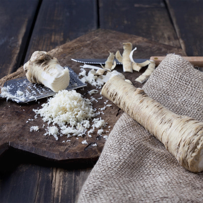 Generations of gardeners have loved horseradish roots for their pungent, peppery and tangy flavor. Our Hybrid Horseradish is a hardy perennial with good disease resistance, and it produces high yields of roots. The plants grow 2-3 ft. tall and have oblong, puckered, dark green leaves. The roots can be dug up in the spring or fall, then peeled and grated. Grated roots have a delightful tang and are often used as a condiment. Once the root is grated, though, it must be used or mixed with vinegar because it becomes bitter and unpleasant when exposed to air and heat for an extended amount of time.