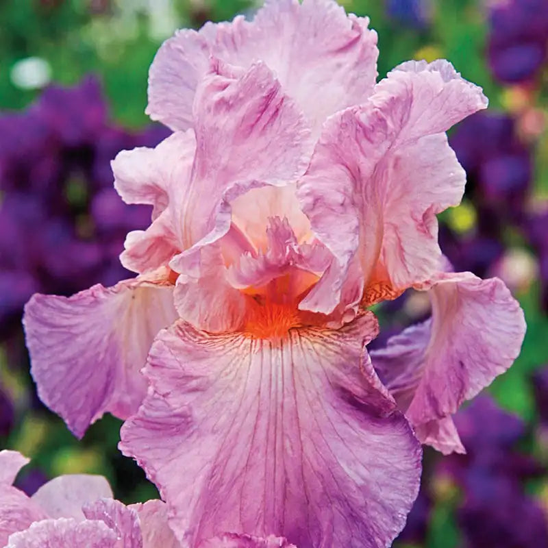 The lavishly ruffled and laced rose-pink flowers with striking tangerine-pink beards stand out in the garden and cut-flower displays. A sweet, light fragrance adds to this popular variety's appeal. Jennifer Rebecca Reblooming Iris first blooms in mid spring and reblooms in late summer to early fall. Like other German Iris or bearded iris, Jennifer Rebecca Iris naturalizes well and deer tend to pass it by. Grows 35 in. tall with green, swordlike foliage. Performs best when planted in full sun to partial shade. Zones 4-9.