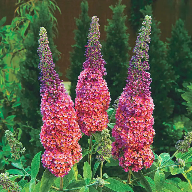 Bicolor Butterfly Bush is the first variety to offer different colors on one panicle - a captivating mix of lavender, butterscotch-yellow and orange that wows garden visitors and attracts flocks and flocks of butterflies and hummingbirds! The tiny star-shaped blossoms bloom from late summer to fall and are the ideal size for pollinators to feed on the nectar. They're also delightfully fragrant and a great choice for cut-flower arrangements. The bush grows 6-8 ft. tall and provides a breathtaking backdrop for other perennials, shrubs and other flowering plants. Bicolor Butterfly Bush is deer resistant and will do best in full sun, at sites with well-drained, humus-enriched soil. Zones 5-9.
