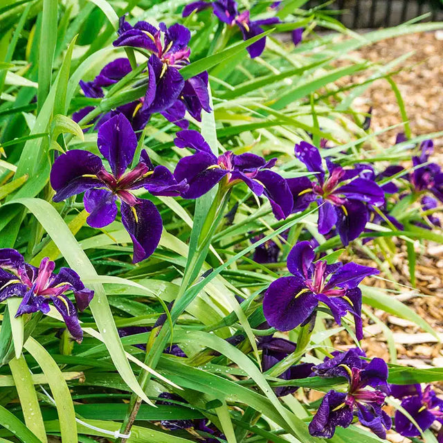 Extend the iris season with this dramatic, multiple award winner. Black Gamecock Louisiana Iris features very deep purple, nearly black, 4-6 in. flowers accented with golden yellow and green, strappy foliage. The blooms add drama and elegance to gardens and cut-flower displays. Because they thrive in moist conditions, they're ideal for planting in water gardens and along the edges of ponds and streams. They'll also perform in average soil. Blooming in early to midsummer, they attract hummingbirds. Deer tend to pass them by. Zones 4-10.