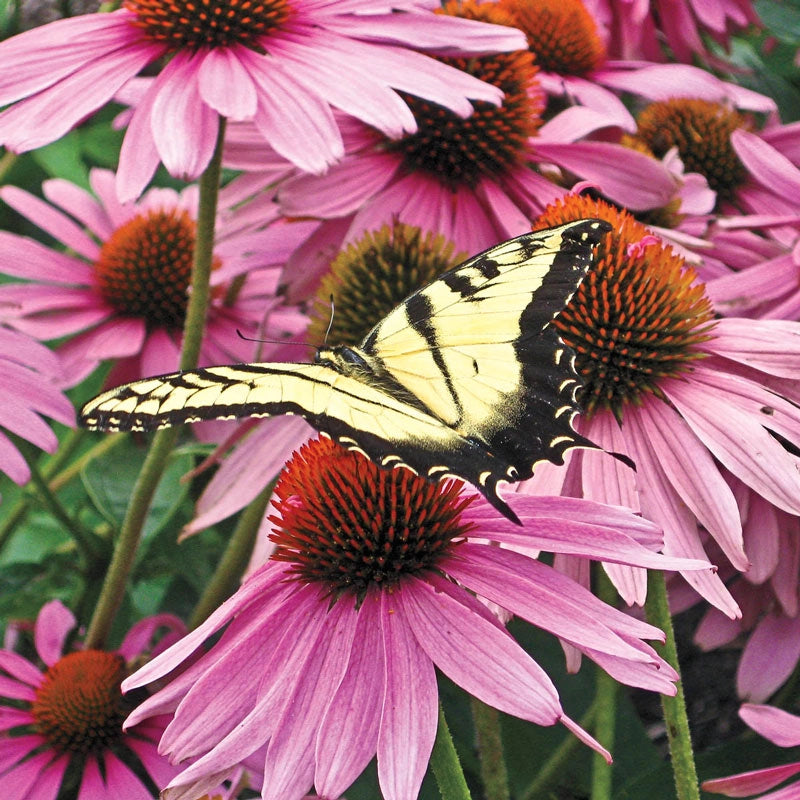 Bring goldfinches and other seed-loving birds to the landscape with Magnus Coneflower. Its rosy-pink petals surround a scarlet-red to bronze central cone. Plant grows 36-48" tall on strong stems that stay upright throughout summer rains and high wind. Coneflower prefer a full-sin site with well-drained soil. Their tall stature makes them ideal for planting at the back of a perennial border or in a mixed container garden where they can take up the center spot. Surround them with shorter flowering varieties or foliage plants for an eye-catching display. These are easy-to-grow perennials that tolerate drought conditions with ease, bloom all summer long until the first frost of fall, and require no maintenance. Butterflies love them, but deer tend to avoid. Hardy in Zones 4-9.