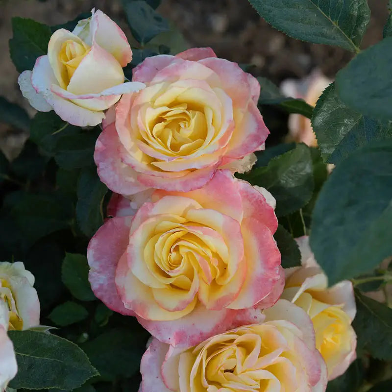 It's love at first blush when this exquisite hybrid tea rose blooms. Classically formed, 4-5 inch flowers open to reveal light yellow petals blushed in pink and scented with a moderately fruity fragrance. Each flower has 25-40 petals and is held on a long cutting stem. Make Me Blush Hybrid Tea Rose grows 4-5 ft. tall and has deep green, glossy foliage. The vigorous plant exhibits excellent disease resistance to powdery mildew, downy mildew and rust as well as good resistance to black spot. Blooms from late spring through summer. Performs best in full sun to partial shade. Zones 5-10. PPAF