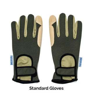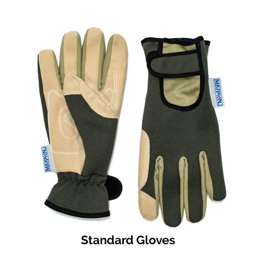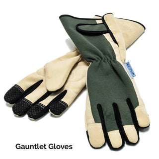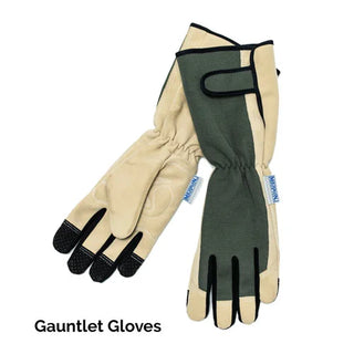 For how much heavy duty wear they go through, a top-quality pair of gloves cannot be overstated. These well-designed gloves are lightweight and breathable, with an adjustable Velcro strap, so they stay in place without cutting off your circulation. They're cooling and comfortable for those long days of garden chores. There's a reinforced palm padding, so shovels and shears don't dig into your hands while you work. The "standard" style gloves top just above the wrist to keep your arms free for motion. The "gauntlet" style covers your forearms, for work with thorny bushes. This style also comes with reinforced fingertips with PVC dots for gripping. Gloves: Size 8 (S/M): 24 cm long; 10.5 cm palm width. Size 10 (L/XL): 26 cm long; 11.5 cm palm width Gauntlet: Size 8 (S/M): 35.5 cm long; 11 cm palm width Size 10 (L/XL): 37.5 cm long; 12 cm palm width