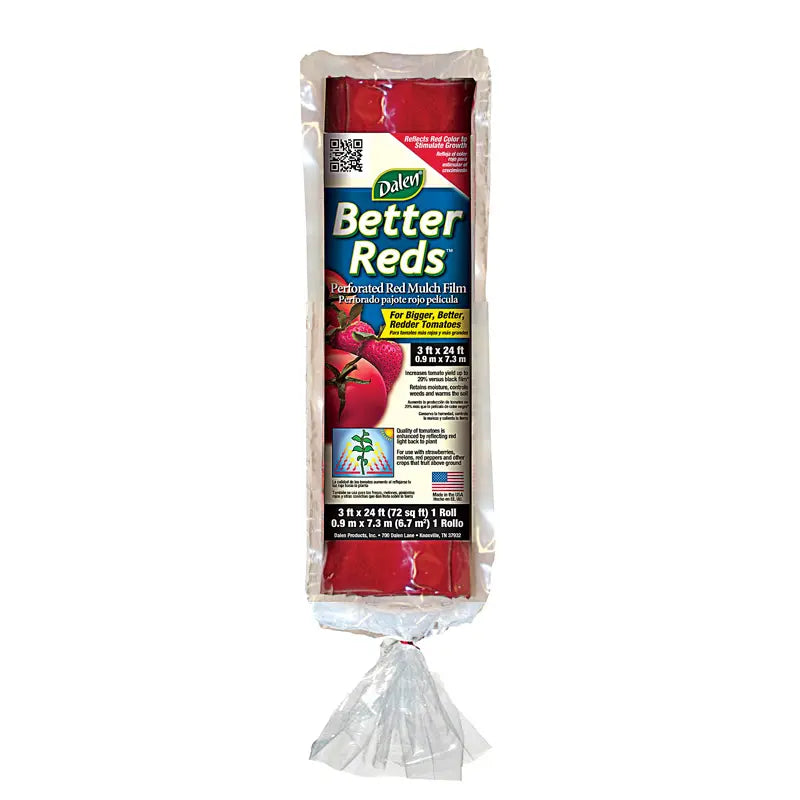 Increase tomato yield up to 20%! Grow bigger tomatoes naturally! The red coloring stimulates growth while the barrier conserves moisture warms the soil controls weeds and reduces disease! Micro-perforations allow air and water to reach soil. 3' x 24' mat can be cut to size. Also for use with peppers strawberries and other above ground fruit. 1 mil plastic.