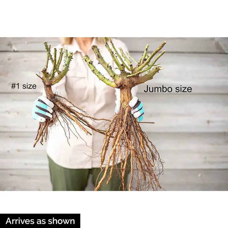 This rose is available in a Jumbo Bareroot size. Ideal for gardeners who hate to wait, jumbo bareroots have a considerable head start over our standard #1 size.