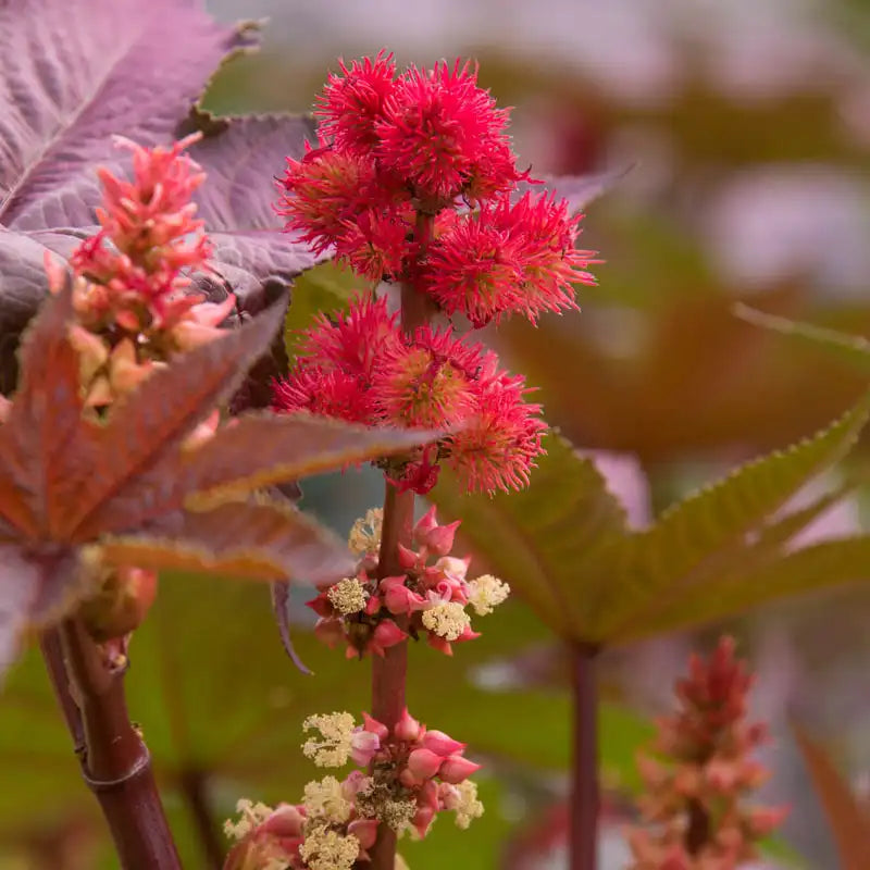 An even more striking version of the stately castor bean, Purple Glow's young foliage starts out very dark purple and contrasts beautifully with the older leaves. The large, tropical-looking leaves provide a dramatic backdrop for the vibrant red flowers. The fast-growing castor bean is grown as an annual in most parts of the United States. Growing 5 ft. tall, it can be grown as a privacy screen or in back borders. Note: Castor Bean seeds are poisonous. Some gardeners, especially those with small pets and children, may choose to remove and discard any seedpods that develop on the plant for this reason. 140-180 DAYS