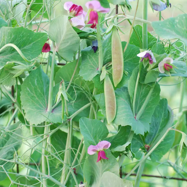 Add color and flavor to your dishes with this two-toned snap pea. Its vibrant green pods are blushed with pink and very sweet and crunchy—a delight to eat raw, in salads or in stir-fry. Spring Blush Snap Pea is also very ornamental, producing bi-colored light violet-white and dark purple flowers and lots of edible, hyper-tendrils that are loaded with nutrition and sweet pea flavor. We like serving them on salads. The vigorous, 5-6 ft. vines produce abundant yields. Snap peas are a cool weather crop and grow well in both the spring and fall garden. 70 DAYS.
