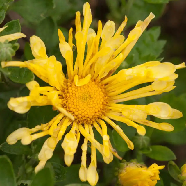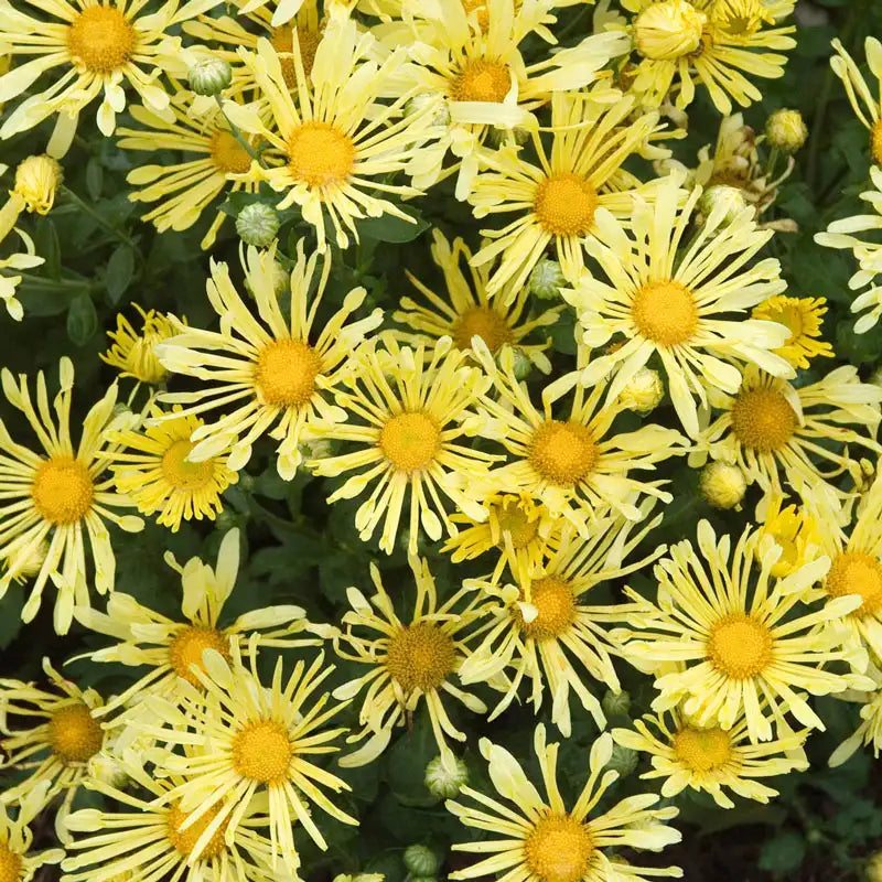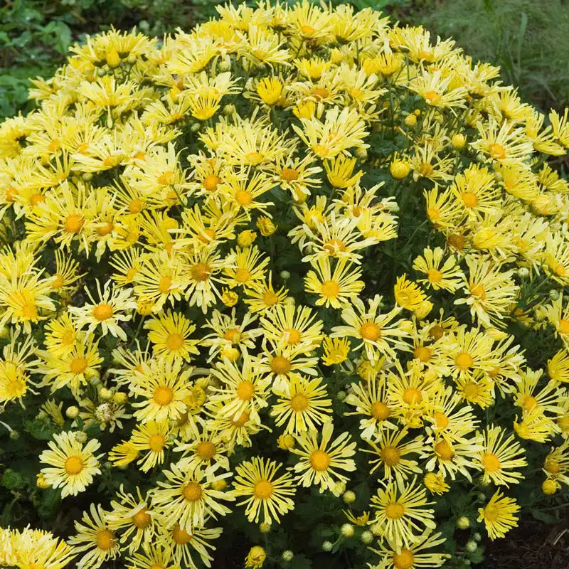 Late-season color doesn't get much easier than this. Our Mammoth Mums are truly perennial mums. Just plant in the spring and allow them to grow—and they'll come back bigger and more beautiful every year. Within three years, you'll have a mounded plant that's 3 ft. tall and 4 ft. across and will be covered in blooms in the fall. No pinching, pruning or deadheading is needed. Bred by the University of Minnesota, Mammoth Mums can withstand sub-zero winter temperatures. Grow Yellow Quill Mammoth Mum as a specimen or in a row as a low hedge. It can also be planted with other colors of Mammoth Mums. It's a deer-resistant perennial that attracts butterflies. Prefers full sun to partial shade. Zones 3-9.